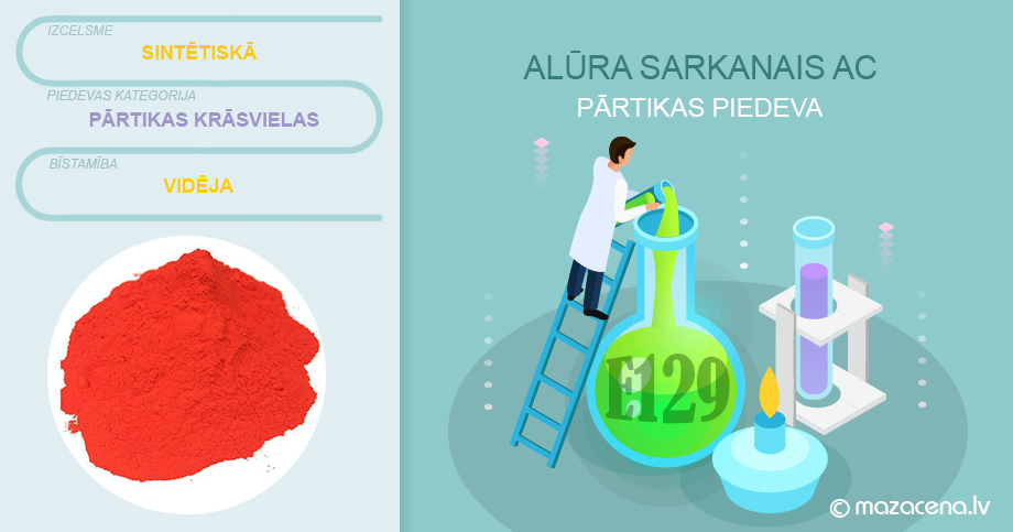 Pārtikas piedeva E129 alūra sarkanais AC – sintētiska krāsviela tumši sarkanas krāsas pulvera veidā, kas sākotnēji iegūta no akmeņogļu darvas, pašlaik tiek ražota galvenokārt no naftas pārstrādes rūpniecības produktiem.