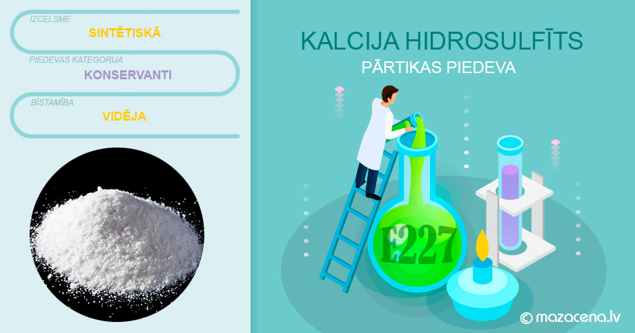 Pārtikas piedeva E227 Kalcija hidrosulfīts ir sintētisks konservants zaļganas krāsas ūdens šķīduma formā. To iegūst, izlaižot sēra dioksīdu caur kalcija hidroksīda ūdens suspensiju.