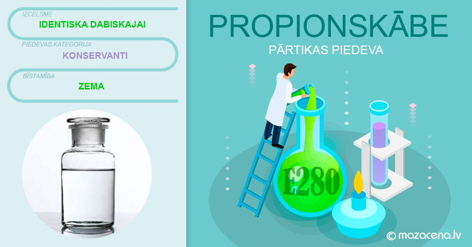 Pārtikas piedeva E280 Propionskābe ir mākslīgs konservants bezkrāsaina kaustiska šķidruma formā ar asu, nepatīkamu aromātu. Dabiskajā formā tas veidojas ogļhidrātu fermentācijas rezultātā, kā arī ir atrodams naftā. Rūpnieciskā mērogā skābi ražo bioloģiski, izmantojot Propionibacterium ģints baktērijas, kā arī ķīmiskā veidā — karbonilējot etilēnu vai katalītisko oksidējot propionisko aldehīdu.